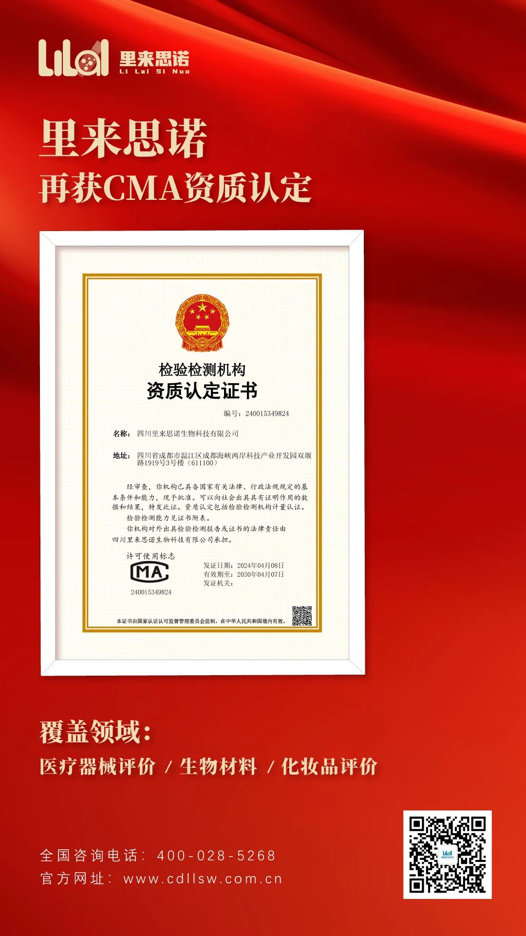 經(jīng)過全員職工四年的持續(xù)努力,在成都醫(yī)學(xué)城管委會(huì)和成都醫(yī)學(xué)城實(shí)驗(yàn)室開放聯(lián)盟的支持下,2024年4月8日,四川里來思諾生物科技有限公司再獲國(guó)家檢驗(yàn)檢測(cè)機(jī)構(gòu)資質(zhì)認(rèn)定(CMA)授權(quán)。此次擴(kuò)項(xiàng)后,公司在醫(yī)療器械和生物材料評(píng)價(jià)領(lǐng)域可完成符合GB/T、YY/T等國(guó)家或行業(yè)標(biāo)準(zhǔn)在內(nèi)的標(biāo)準(zhǔn)化檢驗(yàn)檢測(cè)評(píng)價(jià)服務(wù),可提供生物材料和醫(yī)療器械的可行性、安全性、有效性性等一體化臨床前研發(fā)服務(wù)。