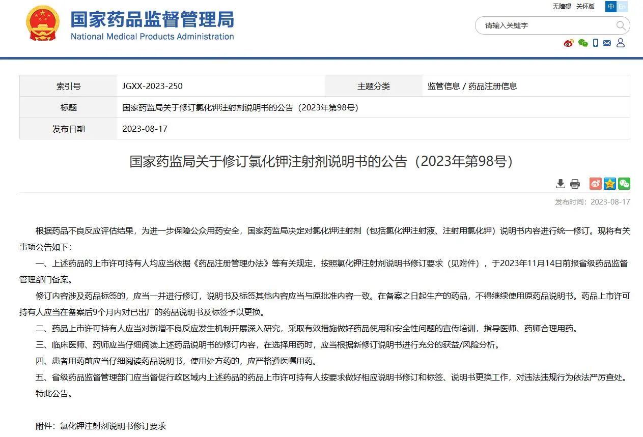 01? 國家藥監(jiān)局關(guān)于修訂氯化鉀注射劑說明書的公告(2023年第98號)