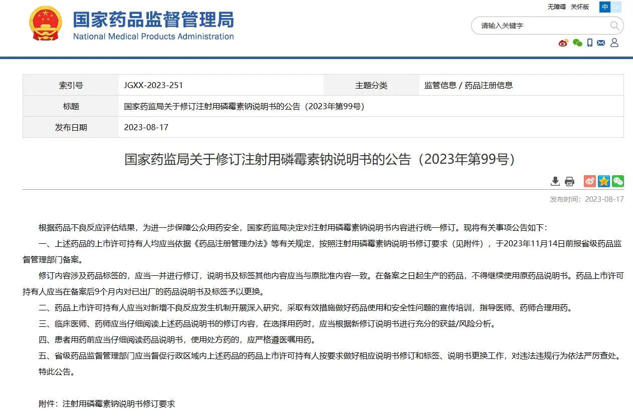 02? 國家藥監(jiān)局關(guān)于修訂注射用磷霉素鈉說明書的公告(2023年第99號)