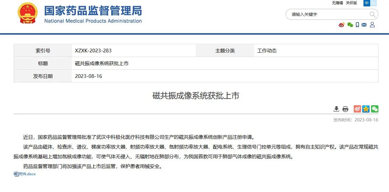 近日,國家藥品監(jiān)督管理局批準(zhǔn)了武漢中科極化醫(yī)療科技有限公司生產(chǎn)的磁共振成像系統(tǒng)創(chuàng)新產(chǎn)品注冊申請。