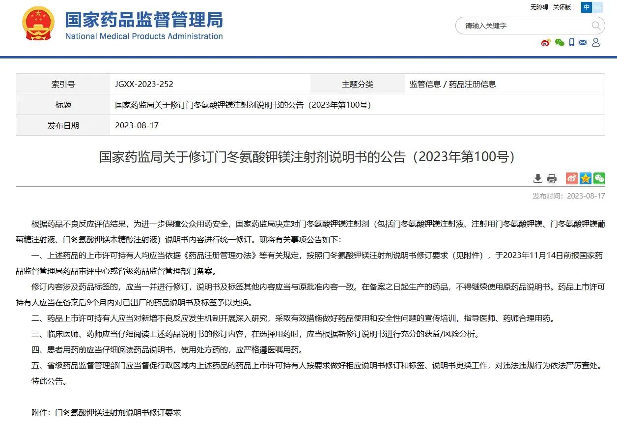 03? 國家藥監(jiān)局關(guān)于修訂門冬氨酸鉀鎂注射劑說明書的公告(2023年第100號)
