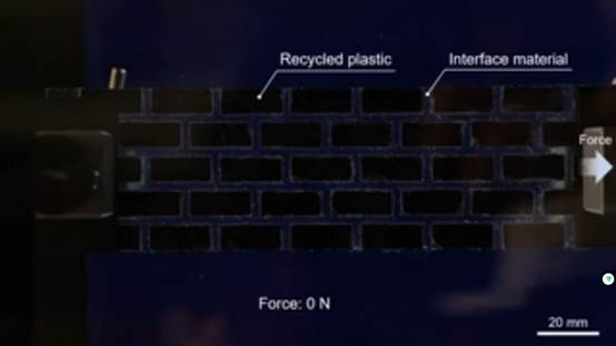 這項仿生材料技術(shù)通過特殊結(jié)構(gòu)設(shè)計,有效應(yīng)對了再生塑料常見的機械性能波動問題。研究人員采用工業(yè)纏繞膜常用的再生高密度聚乙烯(rHDPE)切片作為剛性“磚塊”,模仿貝殼的“磚-泥結(jié)構(gòu)”構(gòu)建多層復(fù)合材料。該結(jié)構(gòu)將剛性rHDPE“磚塊”嵌入軟質(zhì)的原生聚合物基體(充當“灰漿”,實驗中為PDMS)中,形成能夠耗散應(yīng)力和控制失效模式的復(fù)合體系。