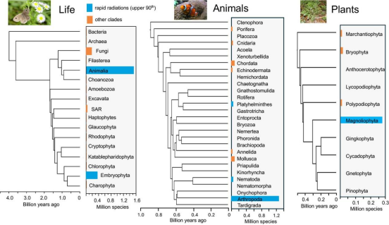 圖2:跨生命、動物和植物的主要進化枝的系統(tǒng)發(fā)育、發(fā)散時間和物種豐富度。