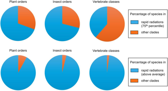 圖4:屬于快速輻射和其他進化枝的物種豐富度在陸地植物目、昆蟲目和脊椎動物類別中的百分比。