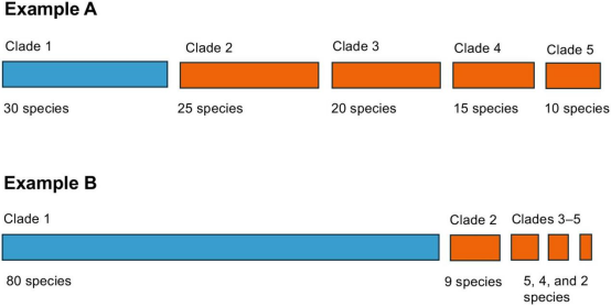 圖1:兩個假設的例子,說明了一個群體中包含在最快速多樣化的進化枝中的物種比例如何變化。