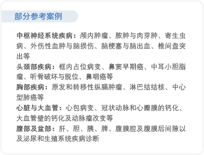 | 神經(jīng)系統(tǒng):顯示腦干、幕下區(qū)、枕大孔區(qū)、脊髓與椎間盤結(jié)構(gòu);可用于腦脫髓鞘疾病、多發(fā)性硬化、腦梗塞、腦與脊髓腫瘤、血腫、脊髓先天異常與脊髓空洞癥的診斷 | 縱膈腫瘤、肺門淋巴結(jié)與中心型肺癌的診斷病變診斷 | 心臟大血管形態(tài)學與動力學無創(chuàng)傷檢查 | 腹部與盆部器官(肝、腎、膀胱、前列腺和子宮),頸部和乳腺 |